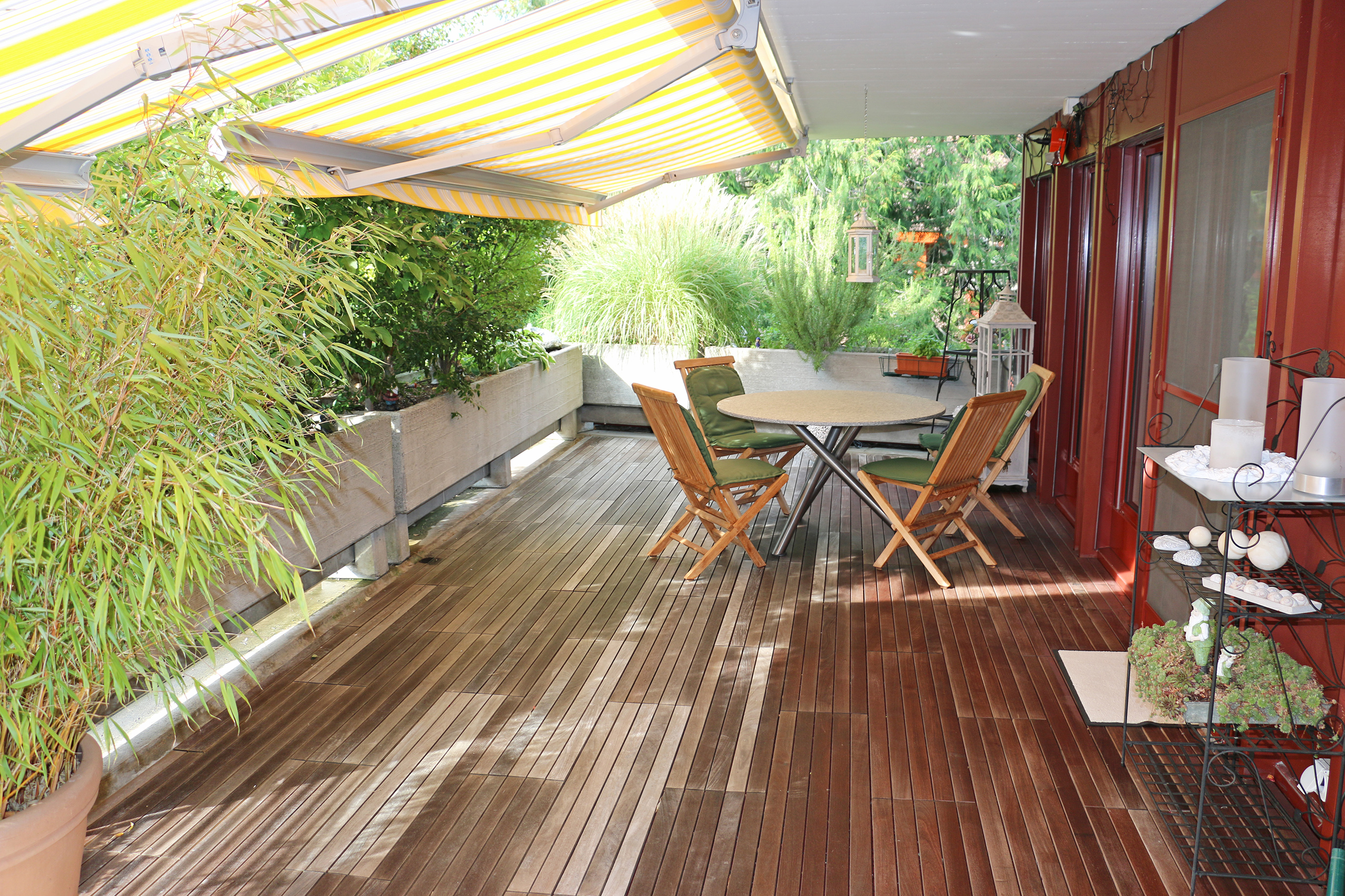 - Sonniger grosser Balkon mit bepflanzten Planzentrögen, ideal zum Entspannen