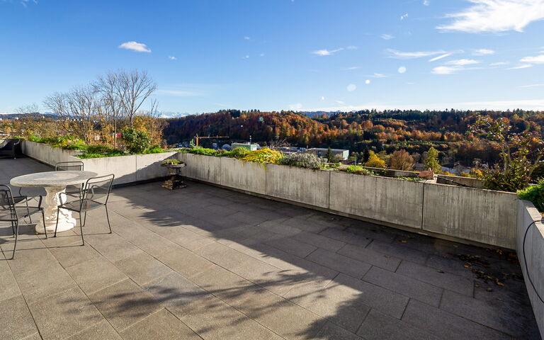 - Grosse Terrasse mit Pflanztrögen, kleiner Gartenbereich am Hang