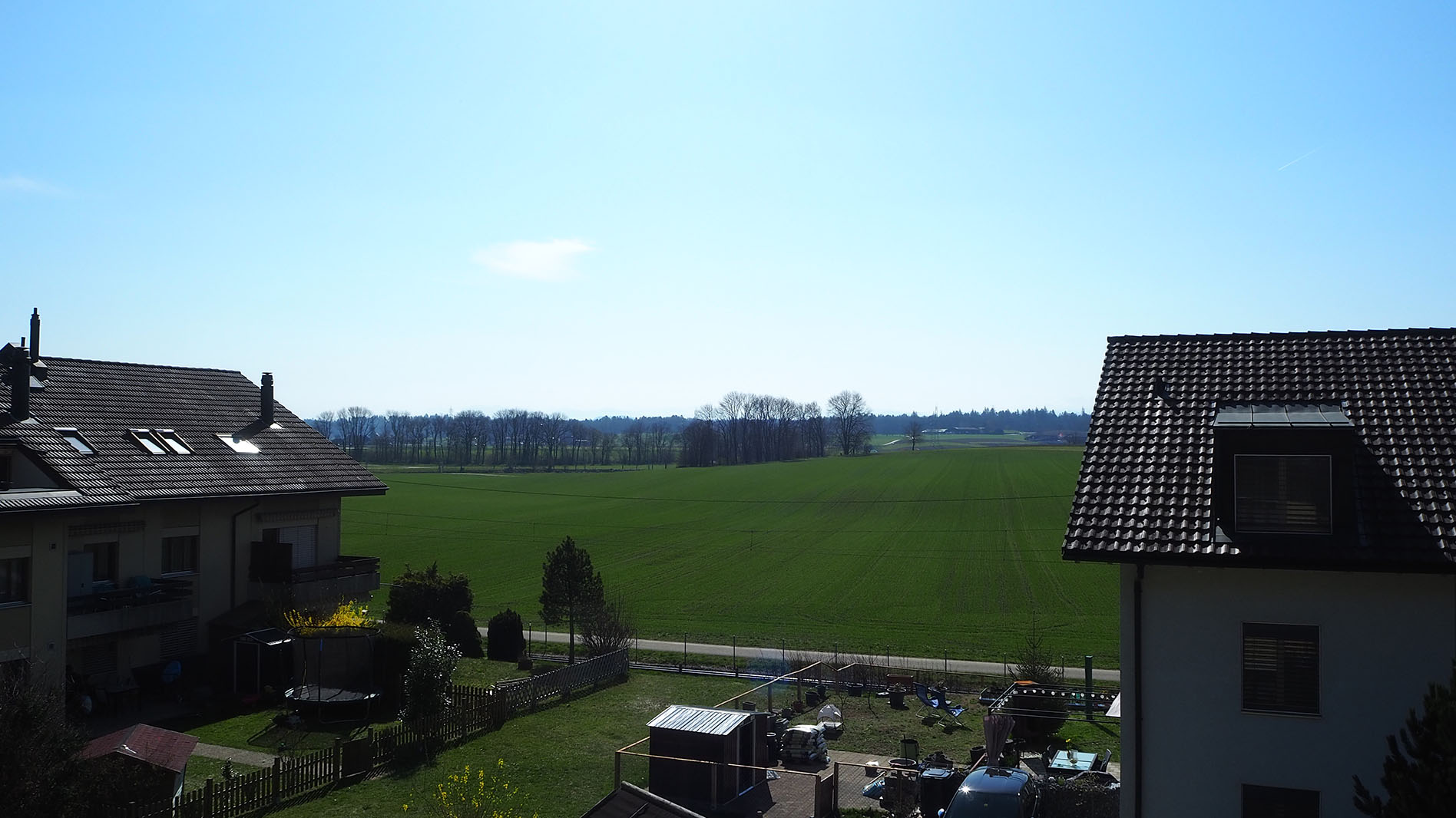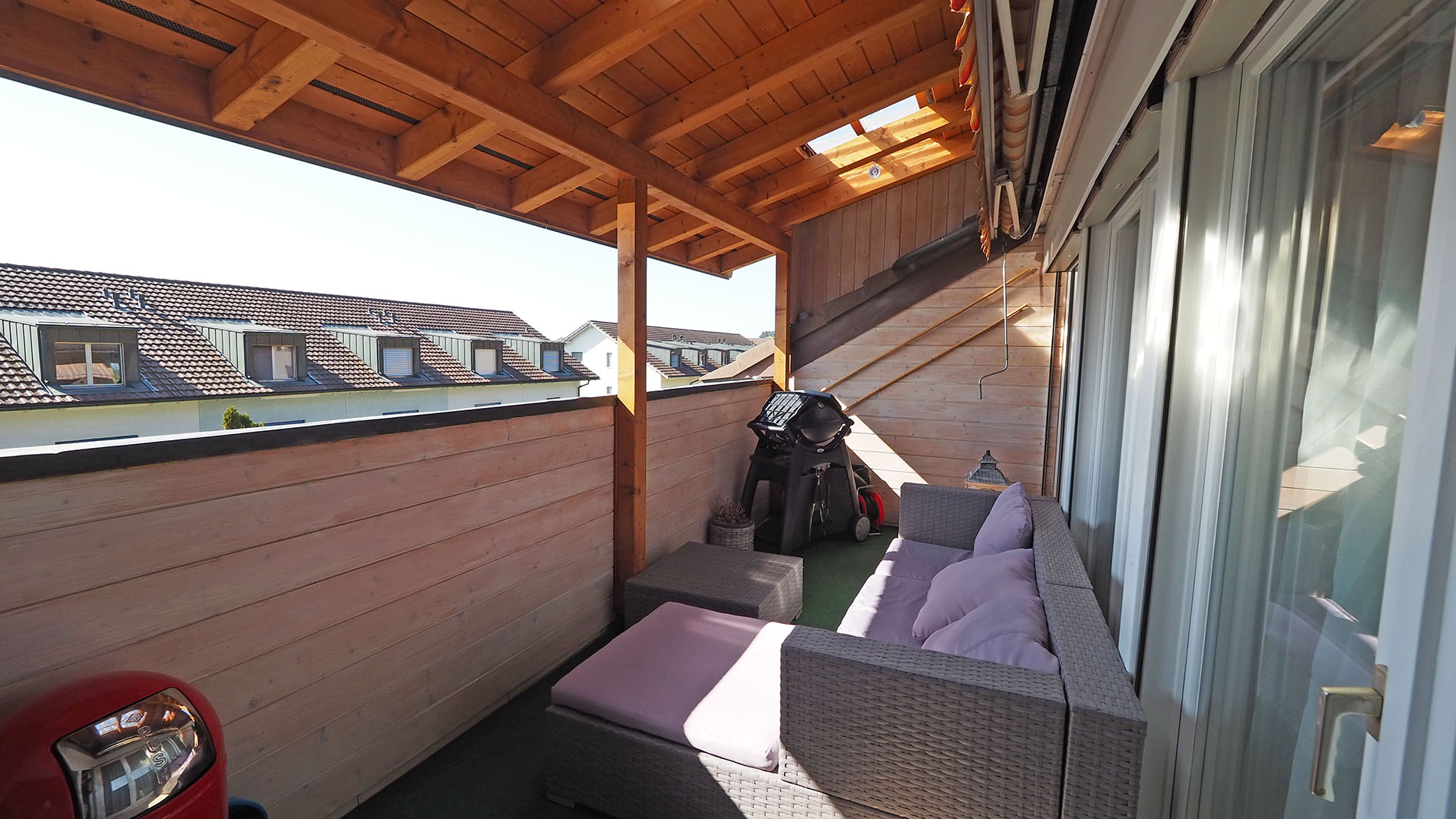 Vom gedeckten windgeschützten Balkon geniesst man die Aussicht ins Grüne und in die Ferne.