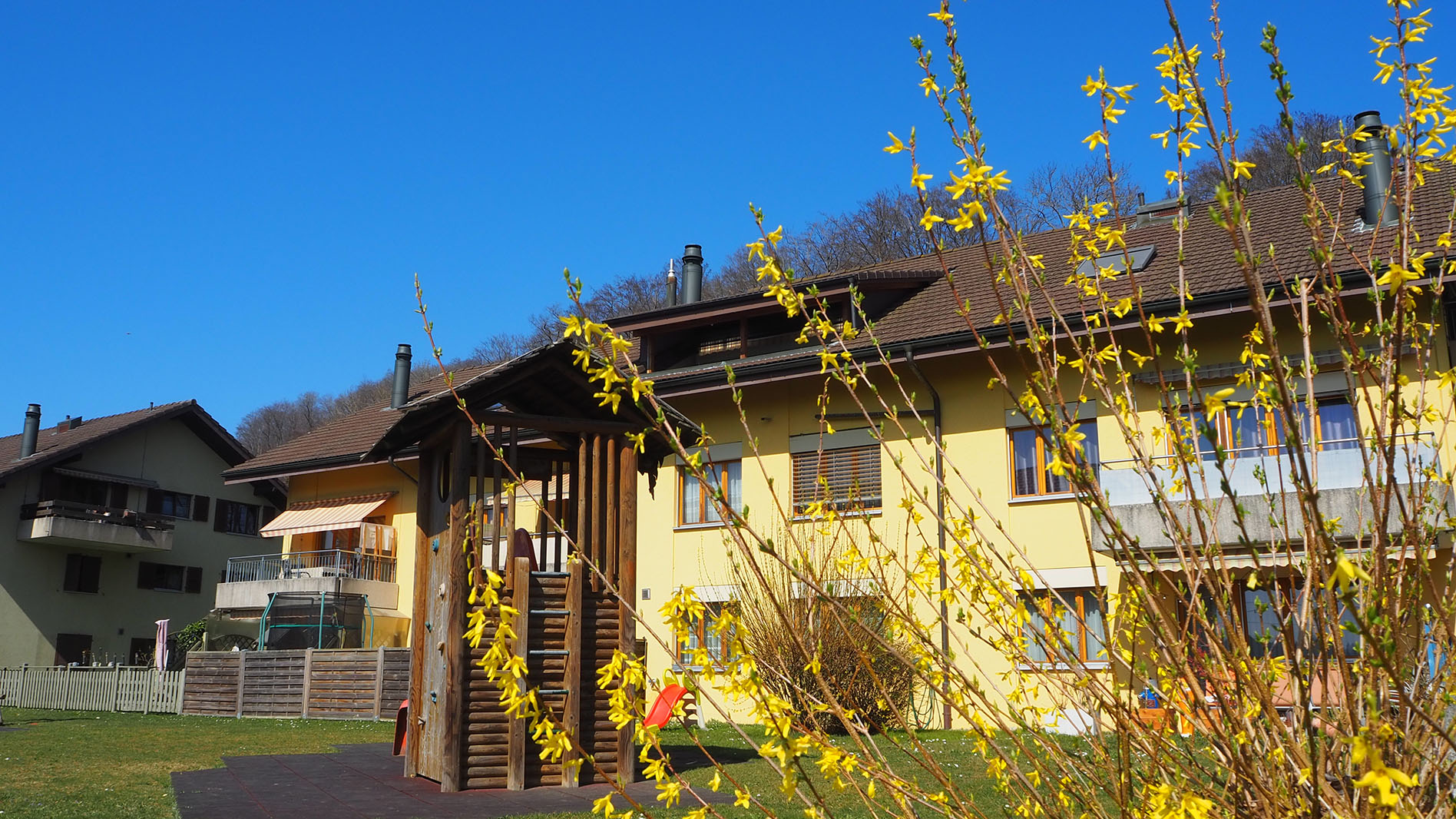 Zur Wohnung gehören ein Bastelraum zur Mitbenützung sowie ein Einstellhallenplatz. Die Umgebung ist mit gepflegter Rasenfläche und einem Kinderspielplatz gestaltet.