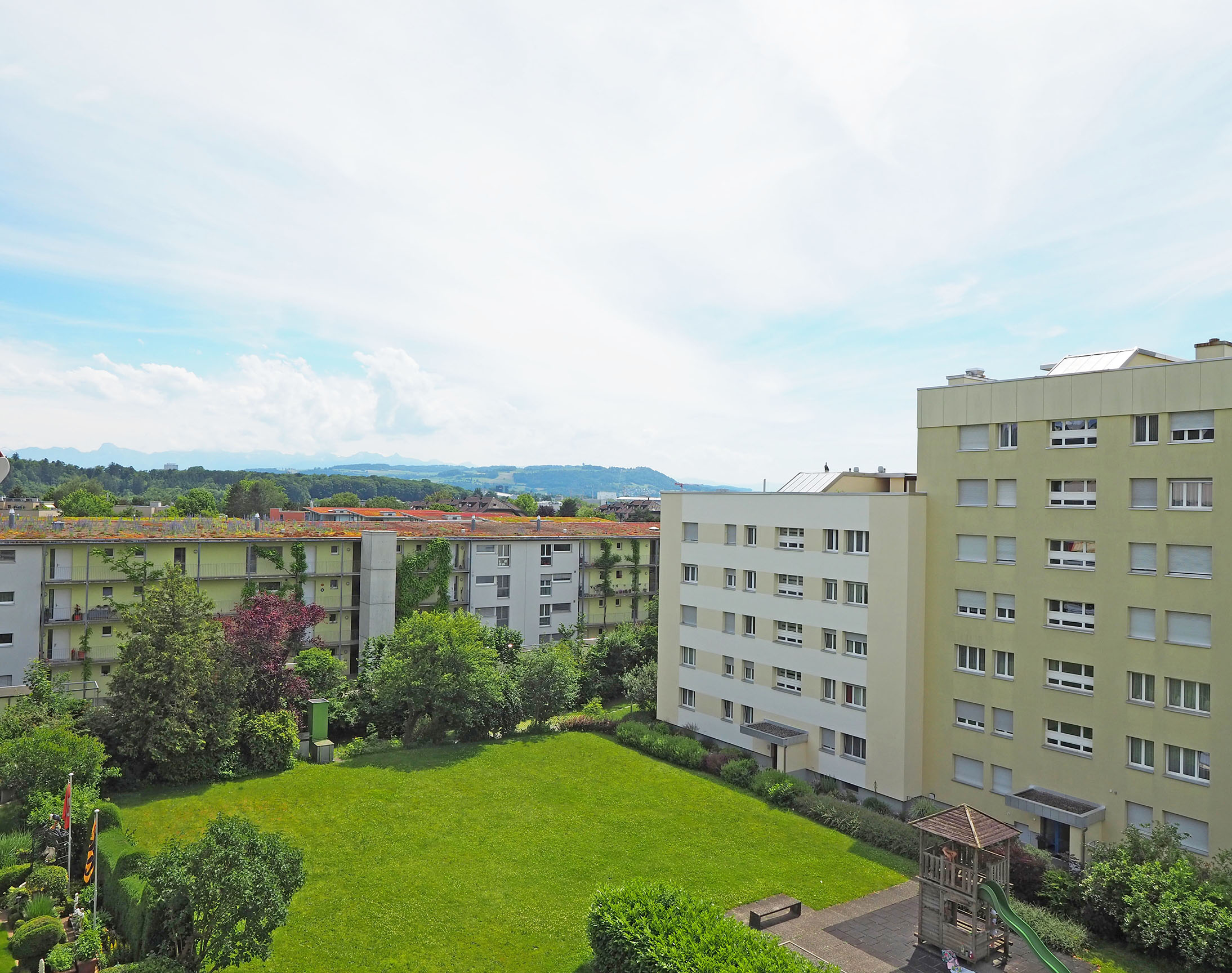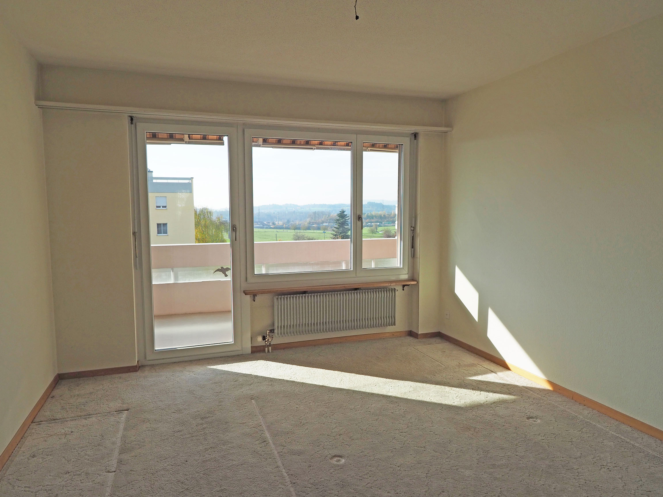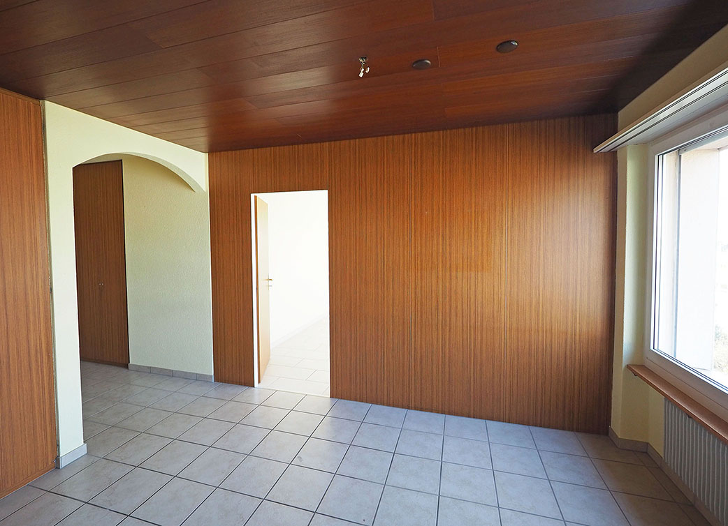 Beim Betreten der Wohnung fällt sofort der praktische Grundriss und grosszügige Wohnbereich auf. Der Essplatz zwischen Wohnraum und Küche ist abgetrennt, diese Bereiche könnten auch miteinander verbunden werden. Der grosse Balkon ist sonnig mit Aussicht ins Grüne und in die Ferne.