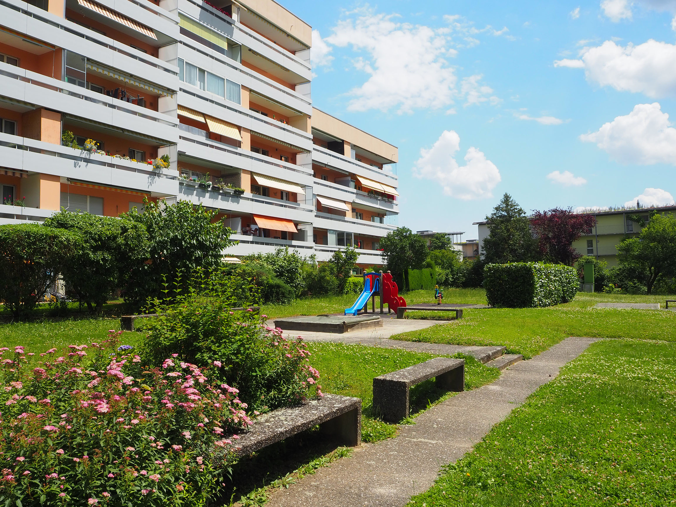 Das Wohnhaus ist von einer gepflegten Grünfläche umgeben und für Familien mit Kindern ist der nahe gelegene Kinderspielplatz und das Hallenbad ein zusätzliches Highlight.